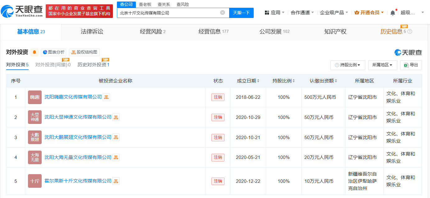 天眼查App显示,北京十斤文化传媒有限公司成立于2019年4月,注册资本10万人民币,法定代表人、执行董事、经理为李雪阳(李雪琴)。变更记录显示,2021年5月,李雪阳(李雪琴)退出该公司股东,新增上海酥年文化艺术策划合伙企业(有限合伙)为股东,后者由李雪琴妈妈贾凤春和杨凡共同出资。2022年3月,该公司发布注销公告,注销原因为决议解散,清算组负责人为李雪阳(李雪琴)。目前,该公司已于2022年6月注销。